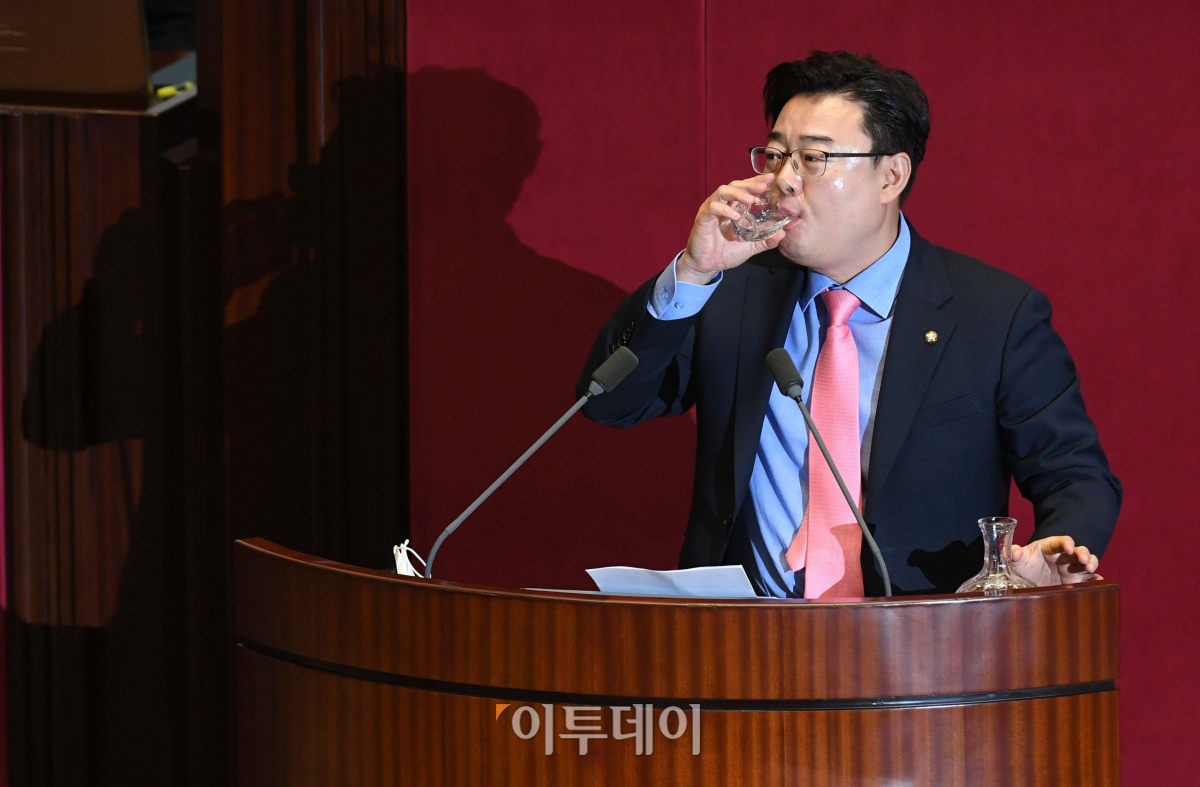 김성원 미래통합당 원내수석부대표가 12일 서울 여의도 국회에서 원구성을 위해 열린 본회의에서 물을 마시고 있다. 이날 예정됐던 21대 국회 상임위원장 선출은 오는 15일로 연기됐다.