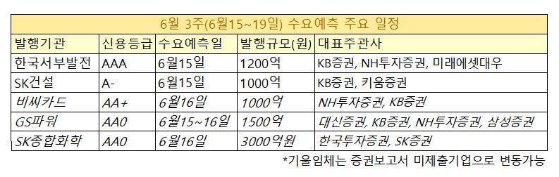 6월 셋째 주(6월 15~19일) 공모 회사채 시장에서는 한국서부발전, SK건설 등이 회사채 발행을 위한 수요예측에 나선다. 이달 들어 공모채 발행시장이 회복 조짐을 보이는 만큼 다음 주 수요 예측에 나서는 기업 역시 이러한 분위기를 이을 것이라는 기대감이 커지고 있다.