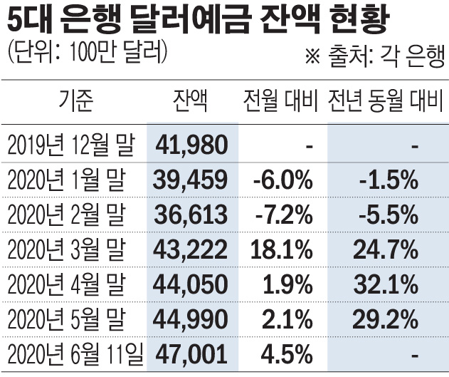 특히 3월 이후 증가세가 두드러졌다. 2월 말 366억1300만 달러였던 달러예금은 코로나19가 확산되면서 3월 말 432억2000만 달러로 한 달 사이 66억 달러나 뛰었다. 이후에도 4월(말 기준·440억5000만 달러)과 5월(말 기준·449억9000만 달러), 6월(11일 기준·470억100만 달러)까지 증가세를 보이고 있다.