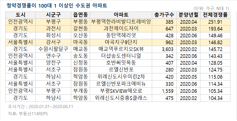 청약 경쟁 과열은 수도권으로도 확산하고 있다. 올해 서울을 포함한 수도권 아파트 청약 경쟁률은 평균 40.7대 1로 지난해(13.6대 1)보다 두 배 넘게 높아졌다. 경기도가 37.21대 1, 인천이 37.33대 1이다. 올해 청약 경쟁률이 평균 100대 1을 넘긴 단지 16곳 중 12곳이 수도권에 있다. 이 가운데 인천 부평구 부평동 '부평역 한라비발디 트레비앙'은 평균 경쟁률 251.91대 1로 올해 최고 인기 단지 자리를 지키고 있다.
