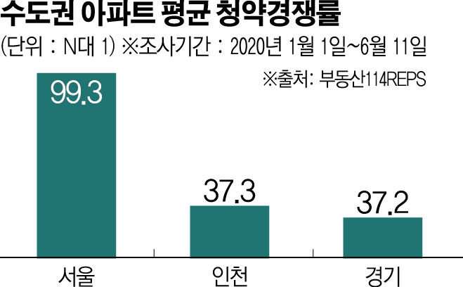 부동산 정보업체 부동산114에 따르면 올해 초부터 이달 11일까지 서울에서 분양한 아파트의 청약 경쟁률은 평균 99.3대 1이다. 청약 경쟁률 집계가 시작된 2000년 이후 가장 높은 수치다. 지난해(31.67대 1)와 비교해도 경쟁률이 세 배 이상 올라갔다. 실제 올해 분양한 서울지역 아파트 8곳 중 4곳에서 청약 경쟁률이 100대 1을 넘겼다.