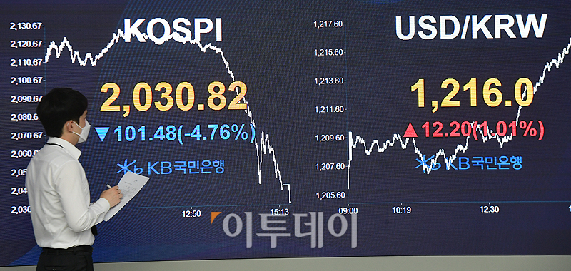 미국, 중국 등지에서 코로나19 재확산 우려가 나오면서 코스피 지수가 급락했다. 15일 서울 여의도 KB국민은행 딜링룸 전광판에 코스피가 전 거래일보다 101.48포인트(4.76%) 내린 2030.82를 나타내고 있다.