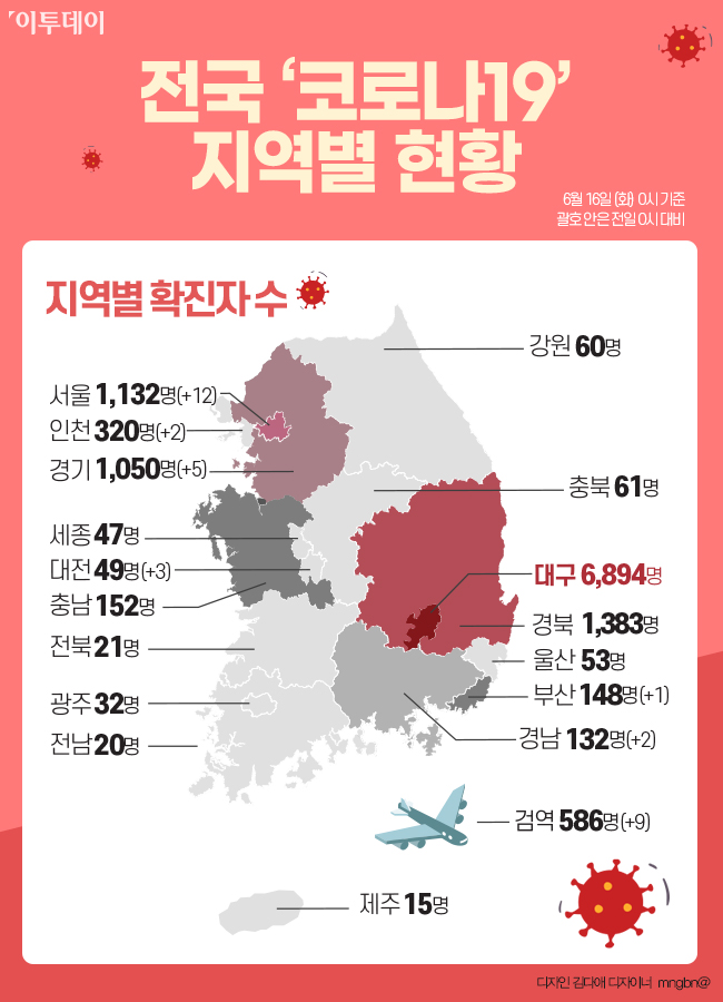 이로써 전국 시·도별 '코로나19' 확진자 수는 △대구 6894명 △경북 1383명으로 가장 많은 비중을 차지했다. 이어 △서울 1132명 △경기 1050명 △검역소 586명 △인천 320명 △충남 152명 △부산 148명 △경남 132명 △충북 61명 △강원 60명 △울산 53명 △대전 49명 △세종 47명 △광주 32명 △전북 21명 △전남 20명 △제주 15명 순으로 나타났다.