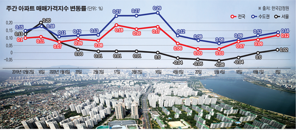 그러나 최근 들어 시장 상황이 심상치 않은 모습이다. 한국감정원의 전국 주간 주택 가격 동향 조사(지난 8일 기준) 결과에 따르면 서울 아파트값은 지난주 대비 0.02% 올라 13주 만에 상승세로 돌아섰다. 서울 25개구 가운데 중구(-0.01%)를 제외한 모든 구에서 집값이 오르거나 보합(0.00%)을 기록했다