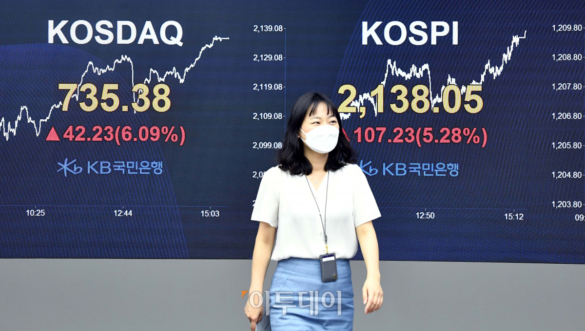 코스피가 5% 넘게 급등 마감한 16일 서울 여의도 KB국민은행 딜링룸 전광판에 코스피가 전 거래일보다 107.23포인트(5.28%)오른 2138.05를 가리키고 있다.