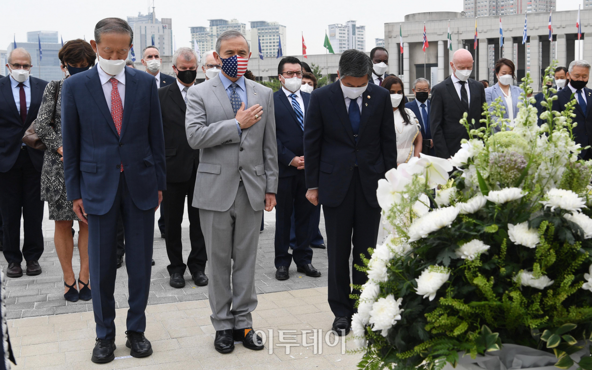 정경두 국방부 장관과 해리 해리스 주한미대사, 허창수 전경련 회장을 비롯한 6.25 참전국 21개국 대사들이 18일 오전 서울 용산 전쟁기념관 평화의 광장에서 6.25 전쟁 70주년 기념 참전국 대사 초청 감사행사 전 UN 참전비에 헌화 후 묵념하고 있다.