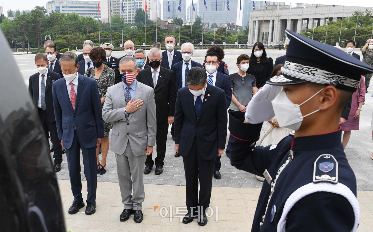 정경두 국방부 장관과 해리 해리스 주한미대사, 허창수 전경련 회장을 비롯한 6.25 참전국 21개국 대사들이 18일 오전 서울 용산 전쟁기념관 평화의 광장에서 6.25 전쟁 70주년 기념 참전국 대사 초청 감사행사 전 UN 참전비에 헌화 후 묵념하고 있다.