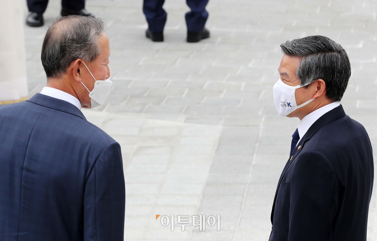 정경두 국방부 장관과 허창수 전경련 회장이 18일 오전 서울 용산 전쟁기념관 평화의 광장에서 6.25 전쟁 70주년 기념 참전국 대사 초청 감사행사 전 만나 대화하고 있다.