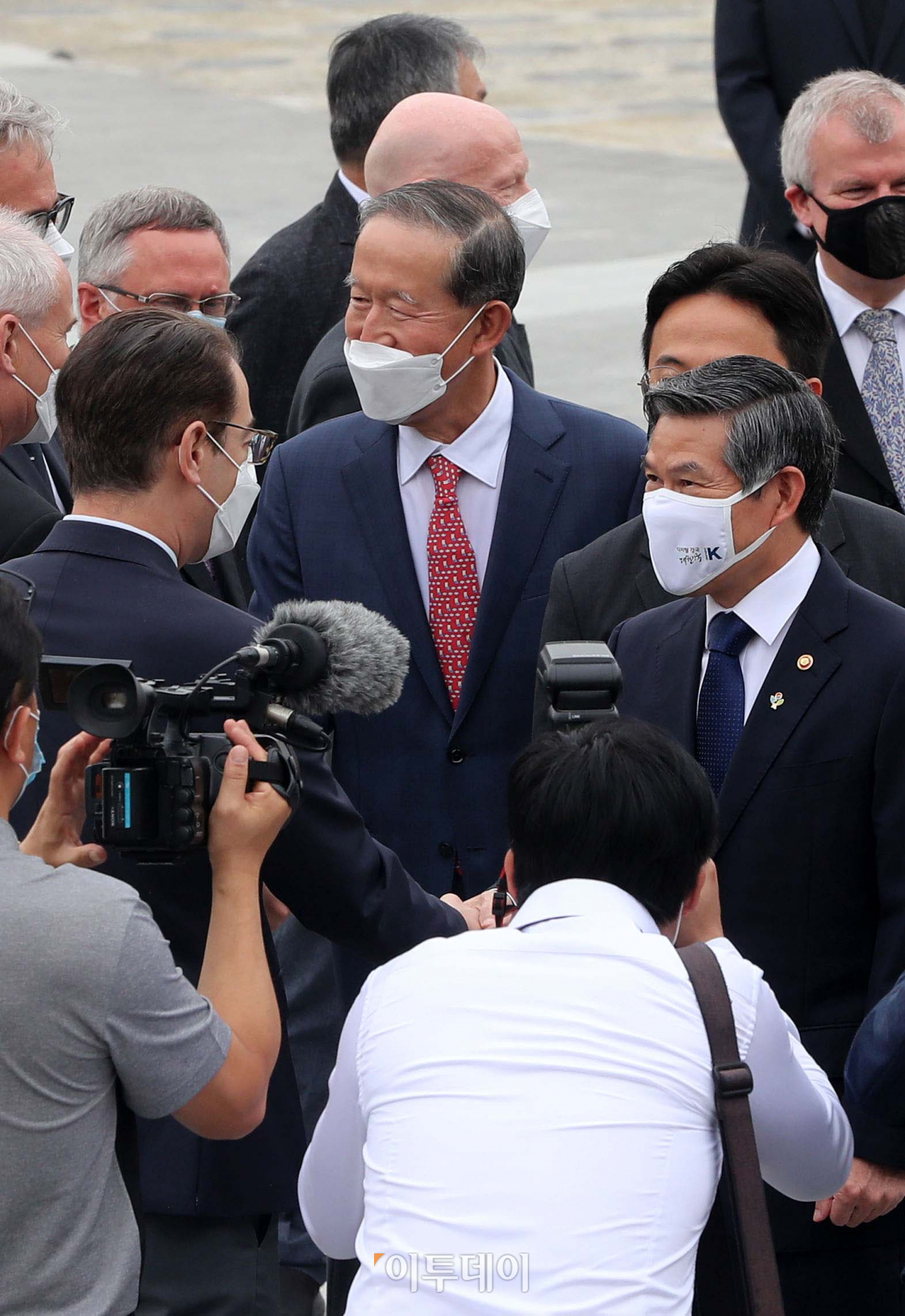 정경두 국방부 장관과 허창수 전경련 회장이 18일 오전 서울 용산 전쟁기념관 평화의 광장에서 6.25 전쟁 70주년 기념 참전국 대사 초청 감사행사 전 참전비 참배를 위해 참석한 대사들과 인사를 하고 있다.