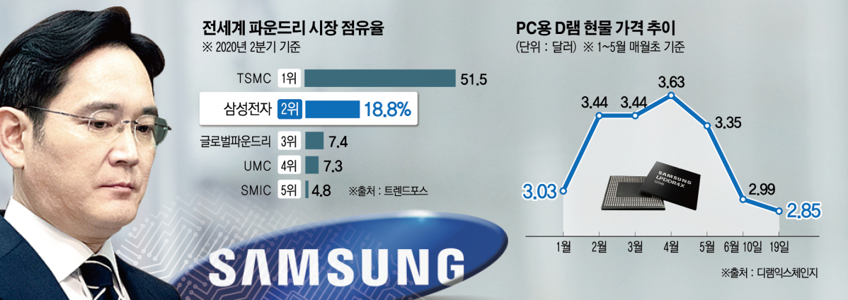 시장조사업체 트렌드포스에 따르면 2분기 매출 기준 삼성전자의 시장 점유율은 18.8%로 직전 분기인 1분기 15.9%보다 2.9%포인트 올랐다. 1위 TSMC는 1분기 54.1%에서 2분기엔 51.5%로 2.6%포인트 떨어졌다. 하지만 여전히 점유율 격차는 무려 30%포인트가 넘는다.