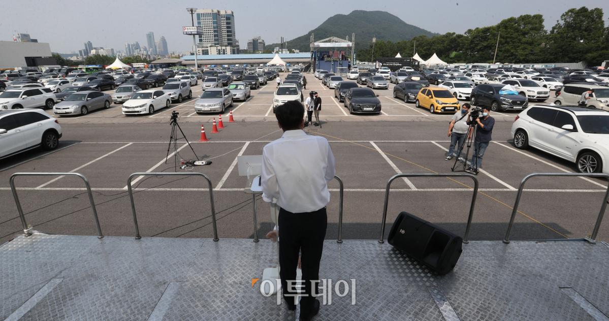 21일 서울 서초구 양재동의 한 주차장에서 종로학원 주최 드라이브스루 입시설명회가 열리고 있다. 이날 대입설명회는 신종 코로나바이러스 감염증(코로나19) 확산 방지를 위해 자료집을 받은 뒤 자동차 안에서 라디오를 통해 설명을 듣는 방식으로 진행됐다.