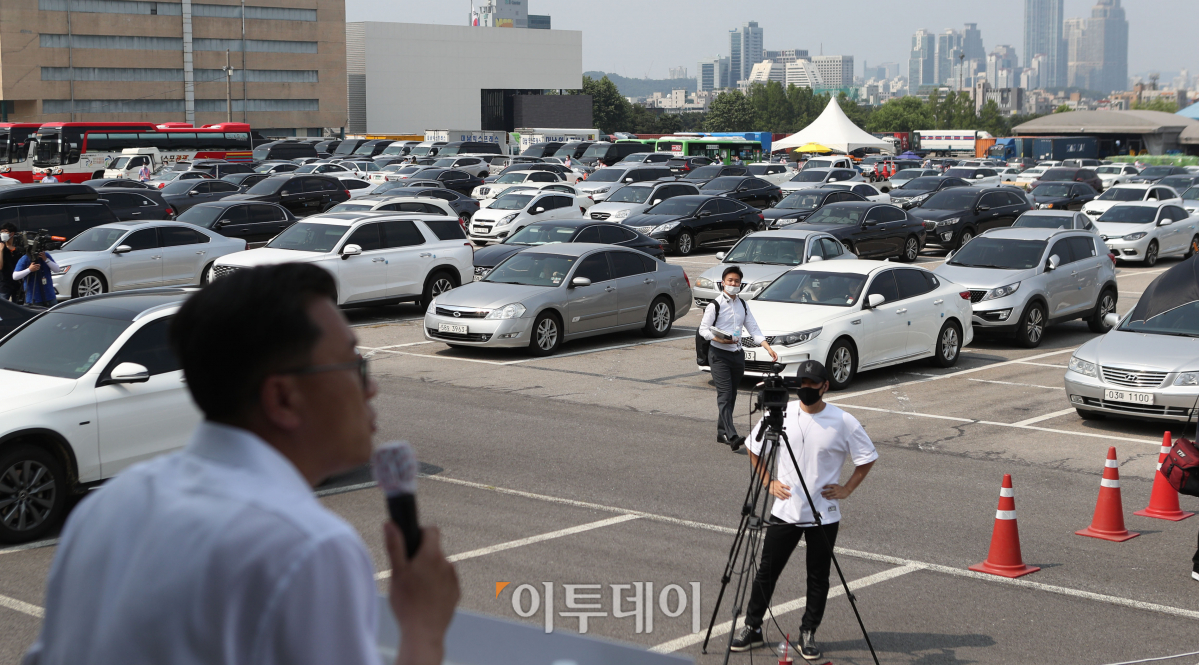 21일 서울 서초구 양재동의 한 주차장에서 종로학원 주최 드라이브스루 입시설명회가 열리고 있다. 이날 대입설명회는 신종 코로나바이러스 감염증(코로나19) 확산 방지를 위해 자료집을 받은 뒤 자동차 안에서 라디오를 통해 설명을 듣는 방식으로 진행됐다.