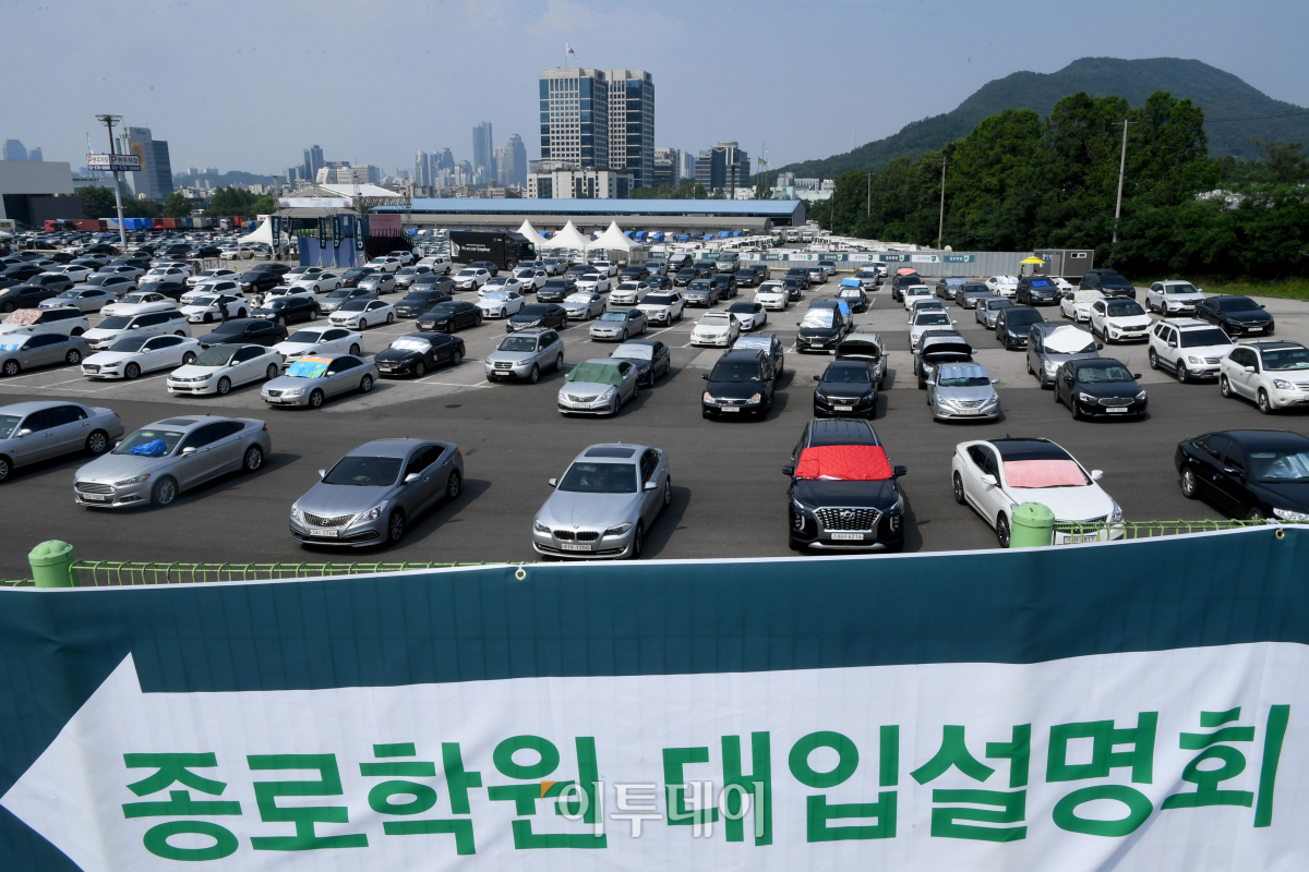 21일 서울 서초구 양재동의 한 주차장에서 종로학원 주최 드라이브스루 입시설명회가 열리고 있다. 이날 대입설명회는 신종 코로나바이러스 감염증(코로나19) 확산 방지를 위해 자료집을 받은 뒤 자동차 안에서 라디오를 통해 설명을 듣는 방식으로 진행됐다.