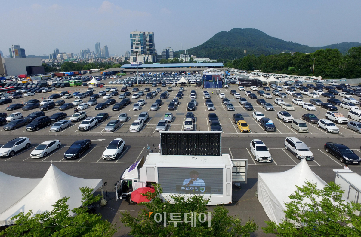 21일 서울 서초구 양재동의 한 주차장에서 종로학원 주최 드라이브스루 입시설명회가 열리고 있다. 이날 대입설명회는 신종 코로나바이러스 감염증(코로나19) 확산 방지를 위해 자료집을 받은 뒤 자동차 안에서 라디오를 통해 설명을 듣는 방식으로 진행됐다.