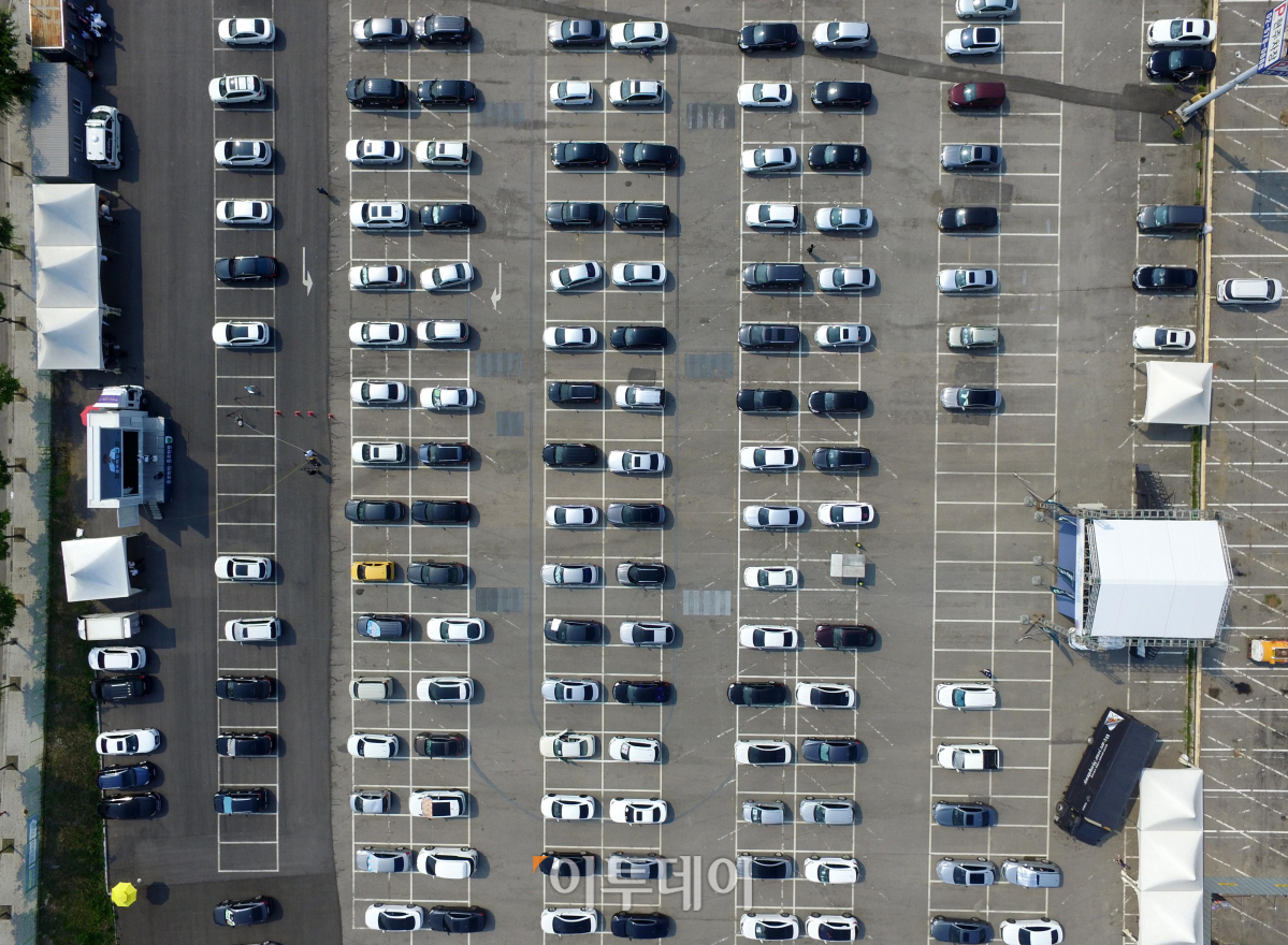 21일 서울 서초구 양재동의 한 주차장에서 종로학원 주최 드라이브스루 입시설명회가 열리고 있다. 이날 대입설명회는 신종 코로나바이러스 감염증(코로나19) 확산 방지를 위해 자료집을 받은 뒤 자동차 안에서 라디오를 통해 설명을 듣는 방식으로 진행됐다.