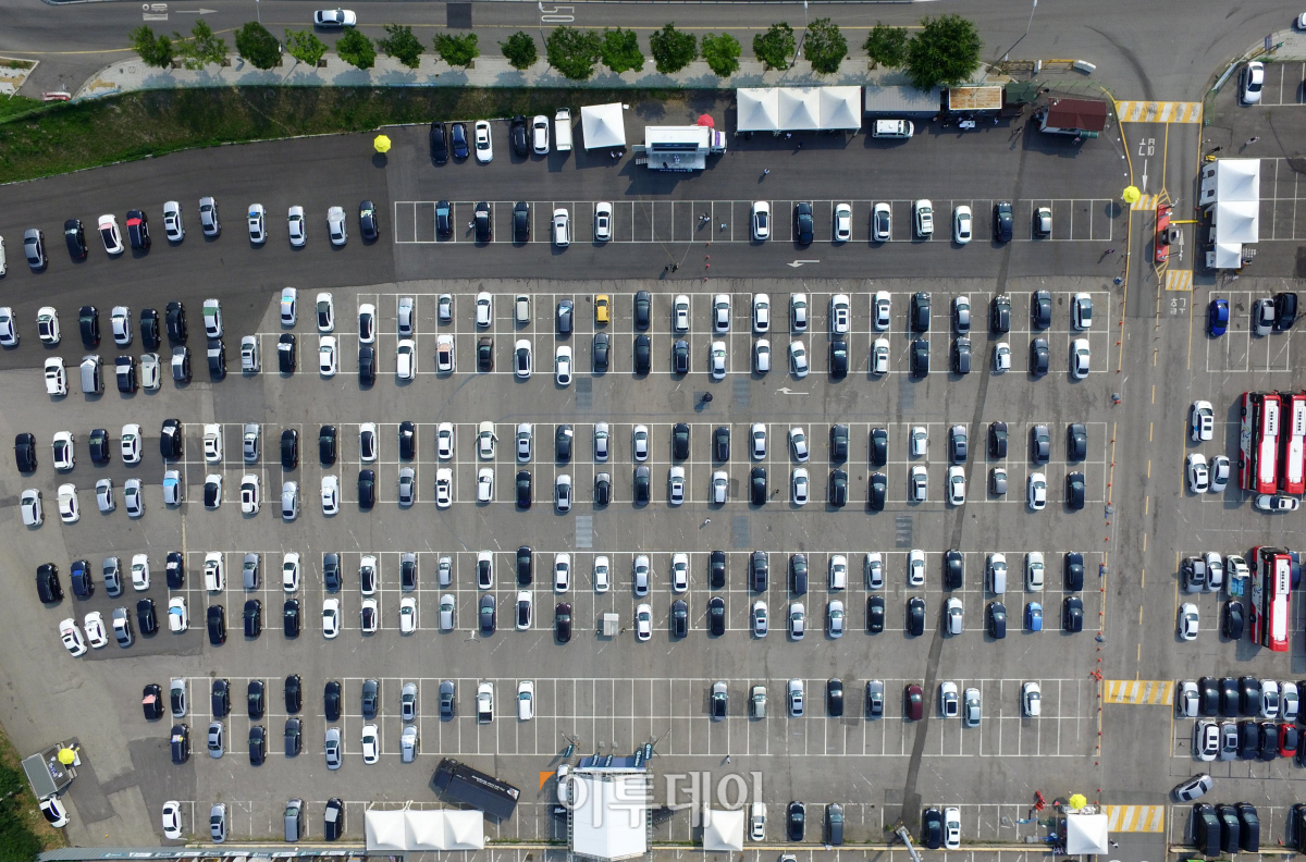 21일 서울 서초구 양재동의 한 주차장에서 종로학원 주최 드라이브스루 입시설명회가 열리고 있다. 이날 대입설명회는 신종 코로나바이러스 감염증(코로나19) 확산 방지를 위해 자료집을 받은 뒤 자동차 안에서 라디오를 통해 설명을 듣는 방식으로 진행됐다.
