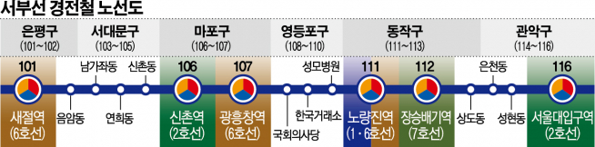 16개역은 새절역, 음암동, 남가좌동, 연희동, 신촌동, 신촌역, 광흥창역, 국회의사당, 한국거래소, 성모병원, 노량진역, 장승배기역, 상도동, 은천동, 성현동, 서울대입구역이다.