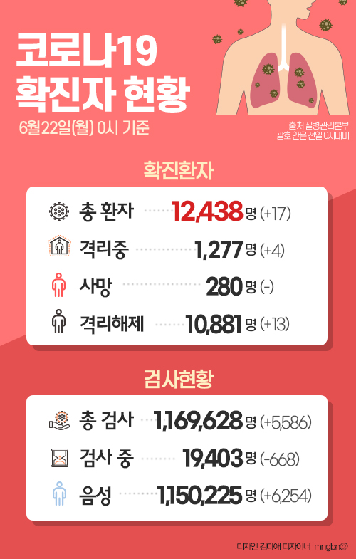 질병관리본부 중앙방역대책본부에 따르면 22일 0시 기준 코로나19 확진자는 전날 0시 발표 때보다 17명 늘었다.
