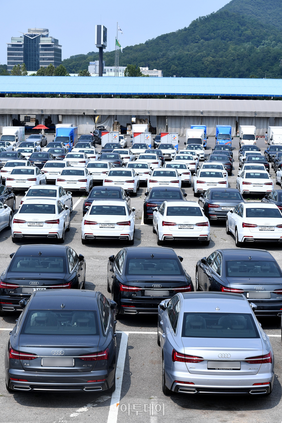 각 서비스센터에 고객대차로 투입될 300여 대의 A6 신차가 '아우디파이낸셜' 법인명의로 등록을 마친 후 서울 양재동 인근에 모여있다.