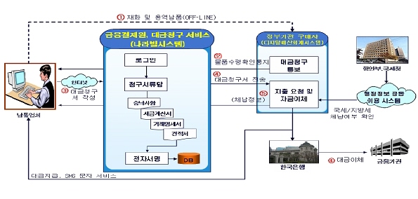 재정부 관계자는 '온라인 대금청구서비스'가 본격 시행되는 경우 납품인이 서면증빙자료를 작성하거나 대금을 청구하기 위해 관공서를 방문해야 했던 불편이 해소된다"며 "국세, 지방세 완납증명서 제출이 폐지되고 각종 증빙자료가 전자화돼 대금청구 소요기간이 평균 2일에서 2시간 이내로 단축된다"고 밝혔다.