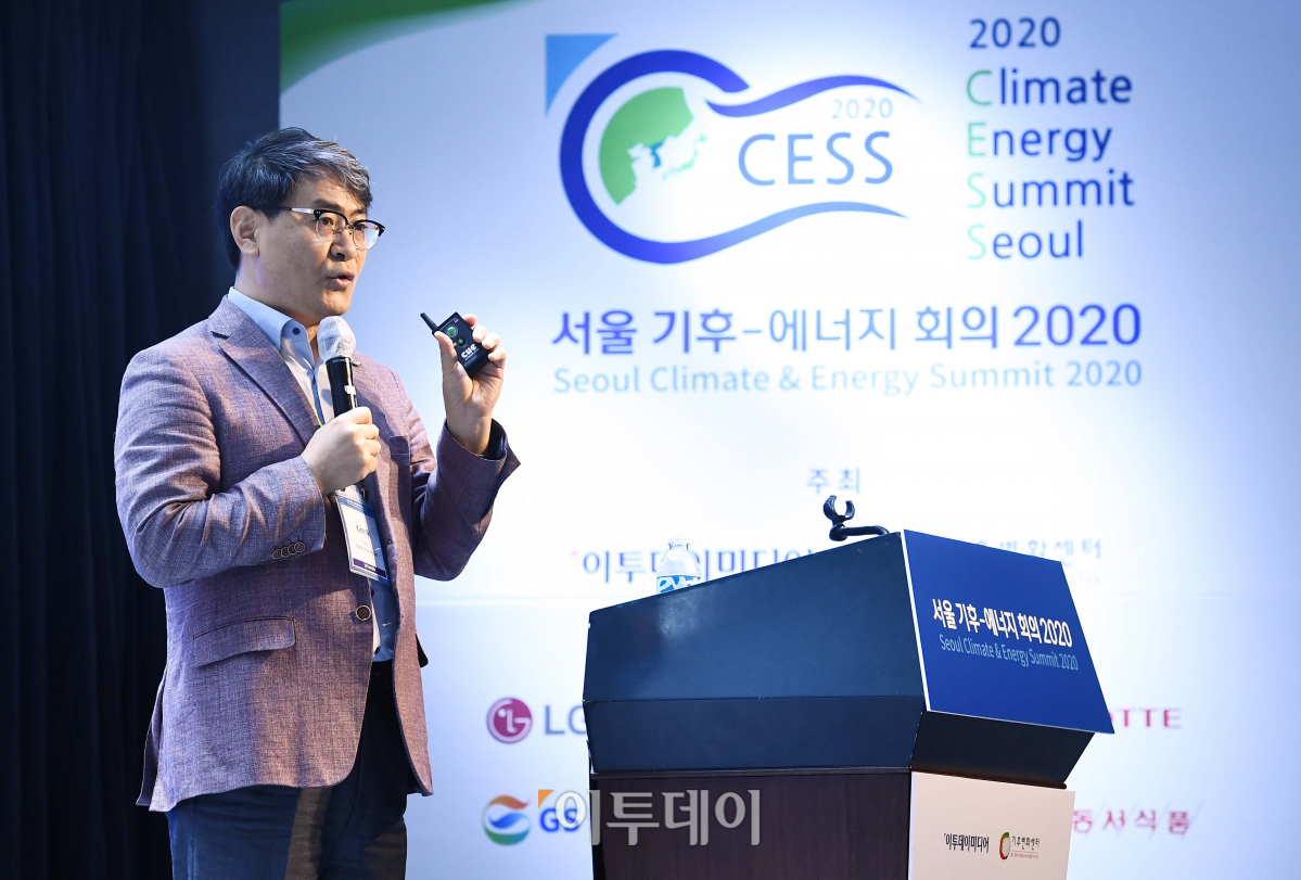 김익 스마트에코 대표이사가 25일 서울 중구 노보텔 앰배서더 서울 동대문 그랜드볼룸에서 열린 '서울 기후-에너지 회의 2020(CESS 2020)'에서 ‘그린뉴딜에서 찾는 순환경제 비즈니스 모델’을 주제로 발표하고 있다. 새로운 물결을 맞이하다 '포스트 코로나 시대' 그린뉴딜을 위한 순환경제를 주제로 열린 이날 행사는 재단법인 기후변화센터와 이투데이미디어가 공동 주최했다.