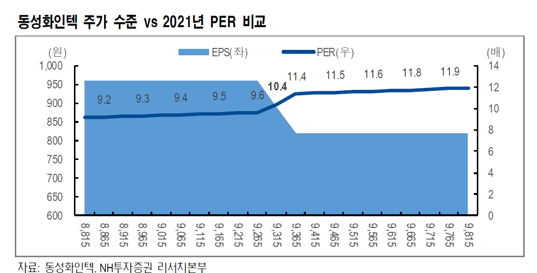 최진명 연구원은 “동성화인텍은 주가수준이 전환권 행사사격 전후를 머무르고 있고, 전환권 행사 가능 시점도 임박함에 따라 희석에 따른 밸류에이션 부담이 확대됐다”고 말했다.