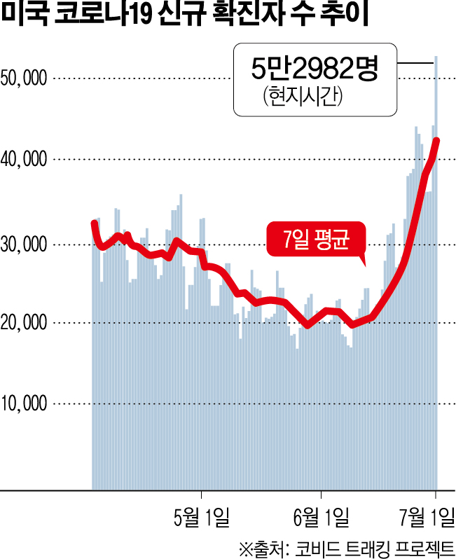 실시간 코로나19 감염 실태를 추적하는 비영리단체 ‘코비드 트래킹 프로젝트’에 따르면 지난 24시간 동안 미국에서 5만2982명이 코로나19 양성 판정을 받았다. 이는 이전 최고 기록이었던 지난달 26일보다 8600명 이상 많은 것이다. 6월 한 달 동안 미국의 일일 신규 코로나19 확진자 증가율은 105%에 달했다.
