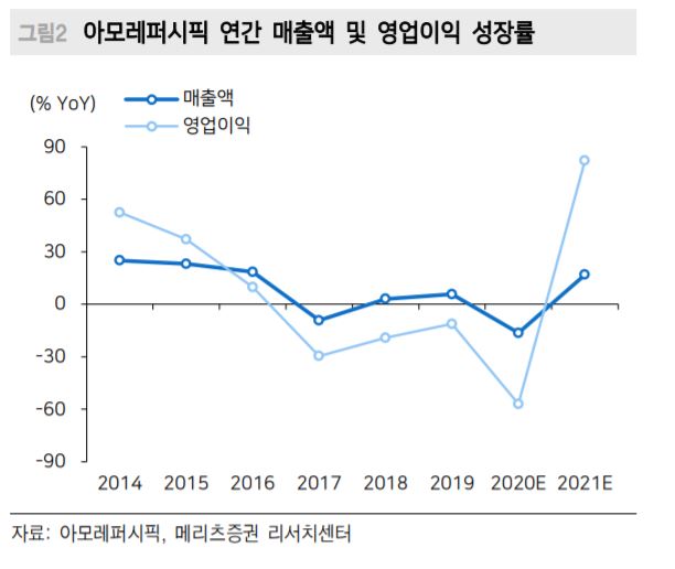 메리츠증권이 3일 아모레퍼시픽에 대해 면세와 중국지역 사업에서의 실적 악화를 예상하면서 단기간 내 상승 전환하기 어려울 것으로 판단했다. 이에 목표주가는 기존 21만 원, 투자의견 매수를 유지했다.