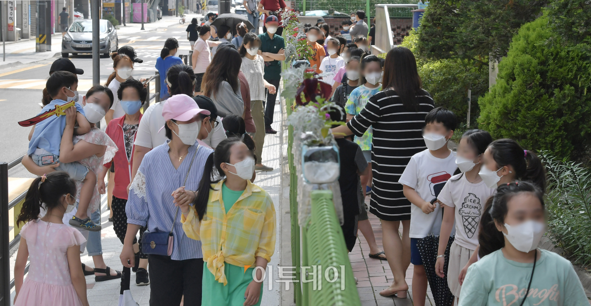 5일 서울 중랑구 묵현초에 마련된 임시 선별진료소에서 학생들이 신종 코로나바이러스 감염증(코로나19) 검사를 받기 위해 줄지어 기다리고 있다. 묵현초에 재학중인 한 학생이 지난 4일 코로나19 확진 판정을 받았으며 중랑구는 묵현초 전체 학생과 교직원에 대해 이날 선별진료소에서 전수검사를 실시했다.