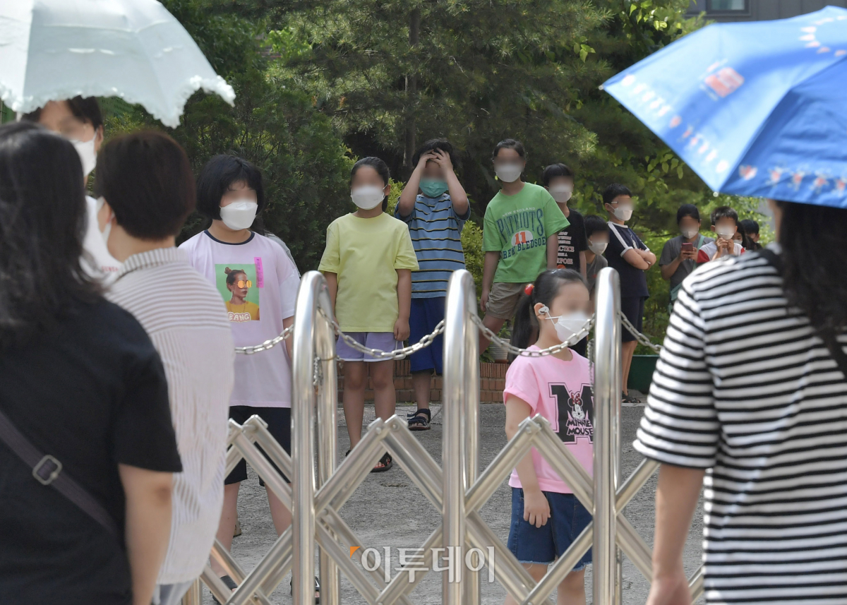 5일 서울 중랑구 묵현초에 마련된 임시 선별진료소에서 학생들이 신종 코로나바이러스 감염증(코로나19) 검사를 받기 위해 줄지어 기다리고 있다. 묵현초에 재학중인 한 학생이 지난 4일 코로나19 확진 판정을 받았으며 중랑구는 묵현초 전체 학생과 교직원에 대해 이날 선별진료소에서 전수검사를 실시했다.