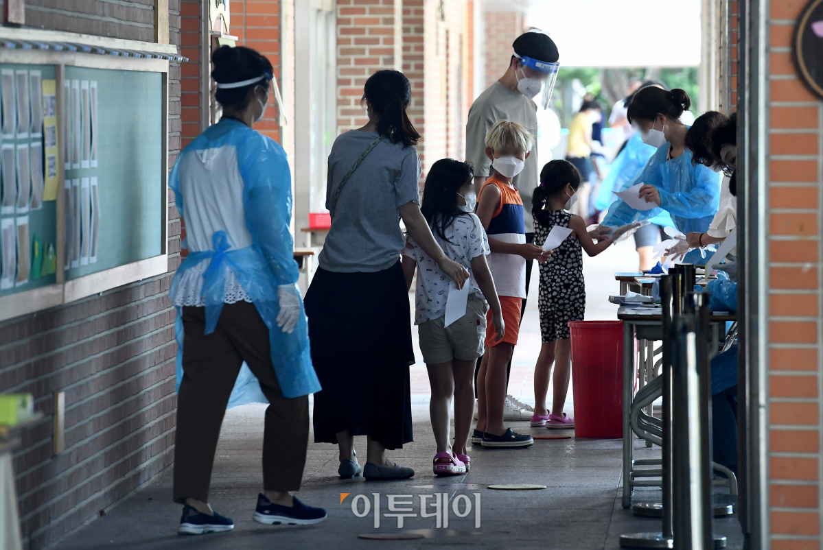5일 서울 중랑구 묵현초에 마련된 임시 선별진료소로 학생들이 신종 코로나바이러스 감염증(코로나19) 검사를 받기 위해 들어서고 있다. 묵현초에 재학중인 한 학생이 지난 4일 코로나19 확진 판정을 받았으며 중랑구는 묵현초 전체 학생과 교직원에 대해 이날 선별진료소에서 전수검사를 실시했다.