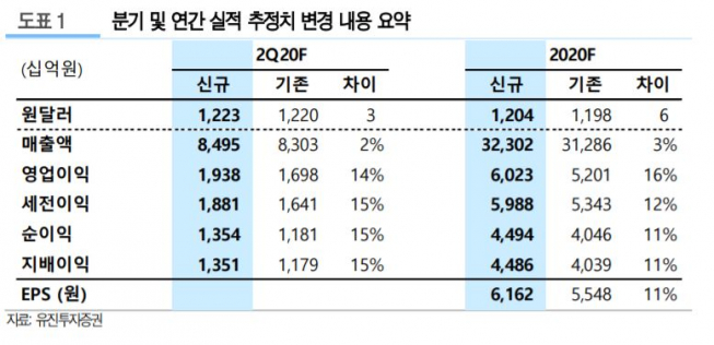 유진투자증권은 회사의 2분기 예상 실적으로 매출액은 8조5000억 원, 영업이익은 1조9400억 원을 기록하면서 시장 기대치를 웃돌 것으로 전망했다.