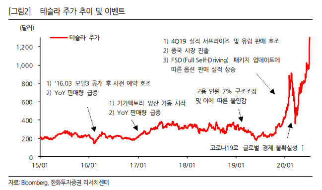 그는 “과거 테슬라 사례를 살펴보면, 전기차 생산량이 기대치를 웃돌거나 예상보다 높은 이익을 달성했을 때 주가가 상승하는 과정을 거쳤다”며 “향후 자동차 배터리의 공급 물량과 손익 개선 속도가 시장 기대치를 뛰어넘는다면, 밸류에이션에 대한 부담은 완화될 것으로 보인다”고 덧붙였다.
