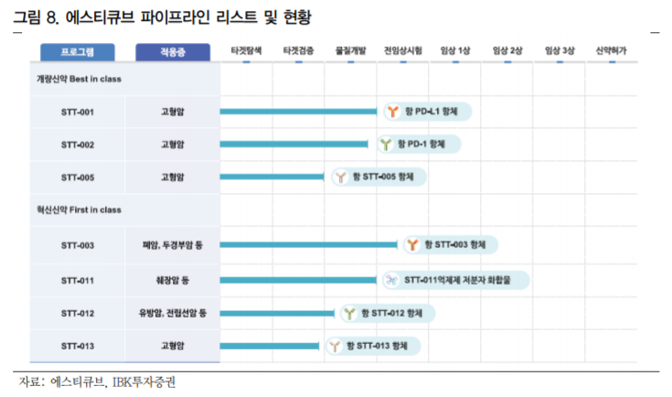 문경준 연구원은 “면역관문억제제는 항암제로서 안정성과 높은 효능에도 불구하고 단독 투여 시 치료에 반응하는 환자의 비율이 20%미만으로 제한적이다”며 “이에 다른 치료방법과 병용하는 임상이 빠르게 증가하고 있는데, 에스티큐브의 파이프라인도 이러한 시장을 고려한 개발전략을 펼치고 있다”고 분석했다.