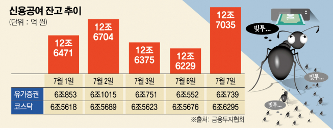 신용거래융자 잔고는 투자자가 주식을 사기 위해 증권사에서 자금을 빌려 주식을 매수한 금액이다. 코로나19로 시장이 폭락한 지난 3월 25일 6조4075억 원까지 내려갔지만 넉 달 만에 두 배나 늘었다.