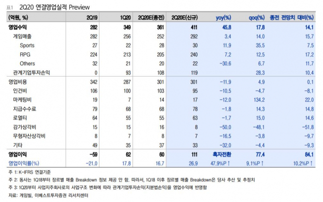 성종화 이베스트투자증권 연구원은 “신작 부재에도 스포츠 장르(게임빌 프로 야구, MLB 퍼펙트이닝 등)가 성수기 효과를 봤으며 RPG 장르에서도 마케팅 강화 효과 등 기존 게임 매출이 전 분기 대비 상당 수준 반등하고 있다”고 설명했다.