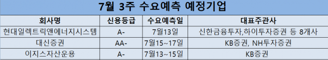 7월 셋째주(13~17일) 공모 회사채 시장에서는 현대일렉트릭앤에너지시스템(이하 현대일렉트릭)과 대신증권, 이지스자산운용 등이 수요예측에 나선다.