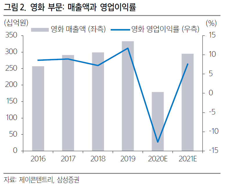 최민하 연구원은 “제이콘텐트리의 2분기 매출액은 733억 원, 영업손실은 104억 원으로 전기에 이어 적자가 예상된다”며 “코로나19 환경이 장기화되면서 영화 사업의 타격이 크다”고 말했다.