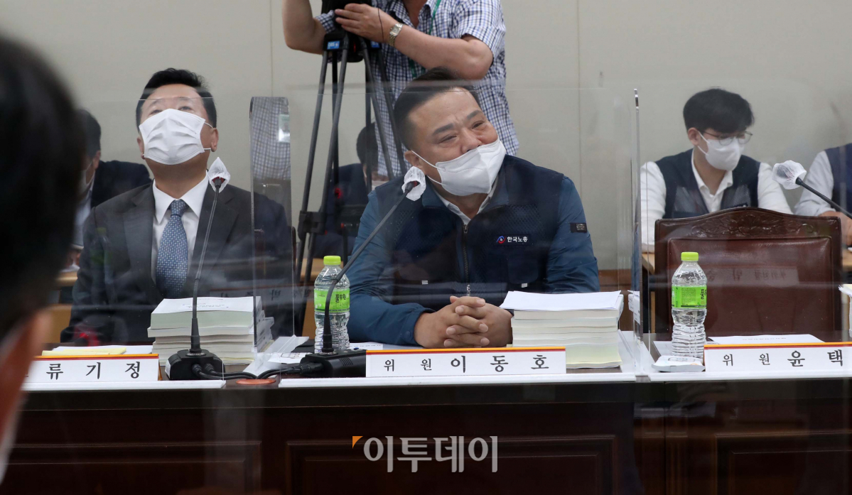 13일 세종 정부세종청사에서 열린 최저임금위원회 8차 전원회의에서 류기정(한국경영자총협회 전무) 사용자 위원과 이동호(한국노총 사무총장) 근로자 위원이 각각 다른 표정으로 앉아 있는 가운데 민주노총 관계자의 자리가 비어 있다.