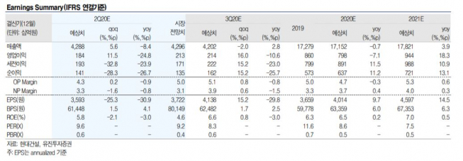 김열매 유진투자증권 연구원은 "코로나19 여파로 싱가포르 현장이 중단되고 2분기에도 영향이 지속됐을 것"이라며 "이밖에도 쿠웨이트, 이라크, 중동 일부 현장에서 공사 진행이 다소 지연된 것으로 파악된다"고 설명했다.