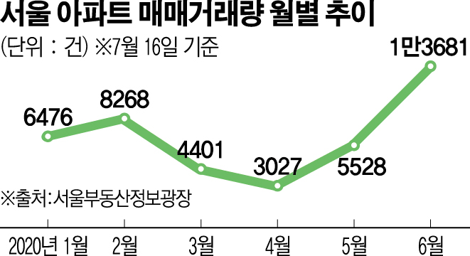 15일 서울부동산정보광장에 따르면 이날 기준 6월 서울 아파트 매매거래량은 총 1만3681건을 기록했다. 올 들어 월별 최고 거래량이다. 이는 2018년 9·13 부동산 대책이 나오기 직전인 8월(1만4966건) 이후 22개월 만에 가장 높은 수치다.