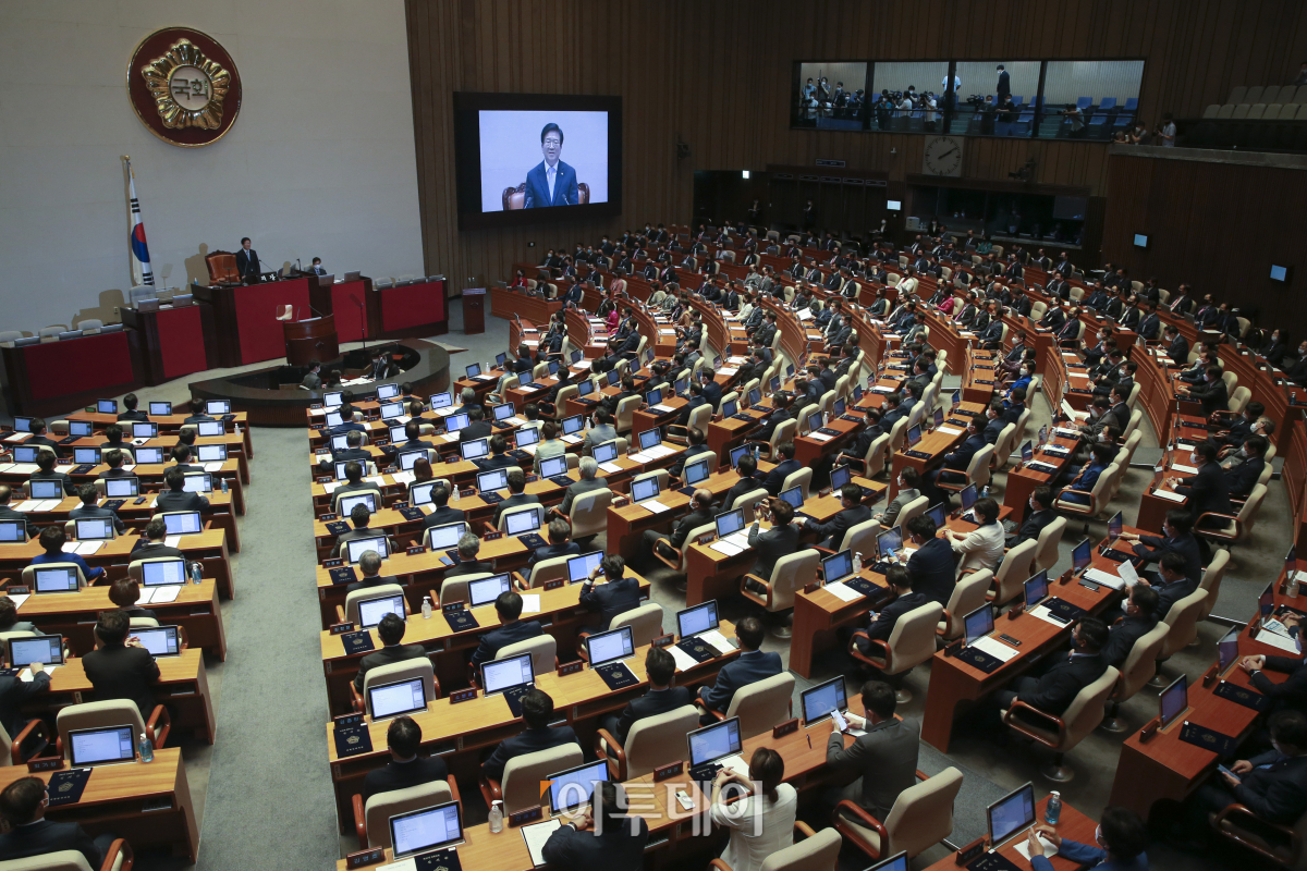 박병석 국회의장이 16일 오후 서울 여의도 국회에서 열린 제21대 개원식에서 개원사를 하고 있다.
