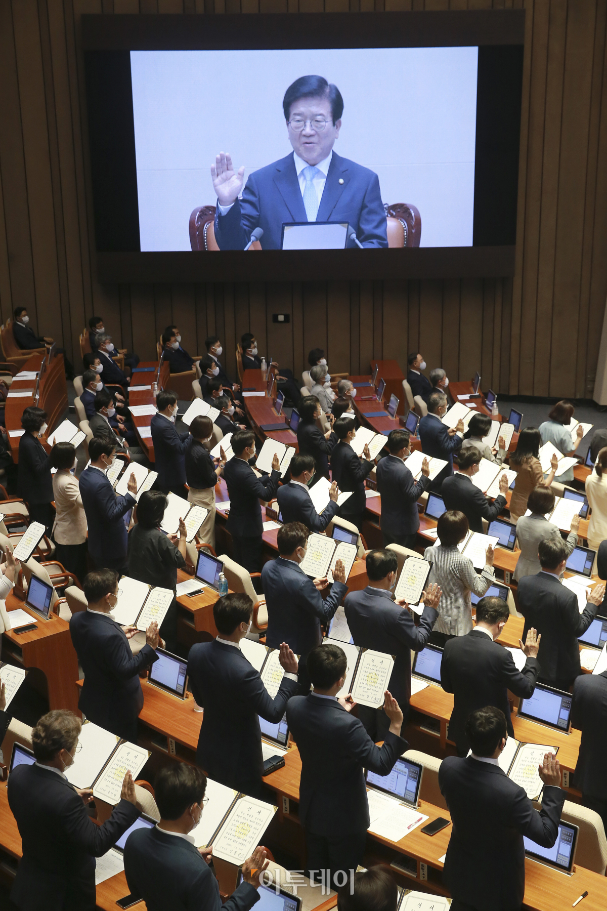 여야 의원들이 16일 오후 서울 여의도 국회에서 열린 제21대 개원식에서 국회의원 선서를 하고 있다.
