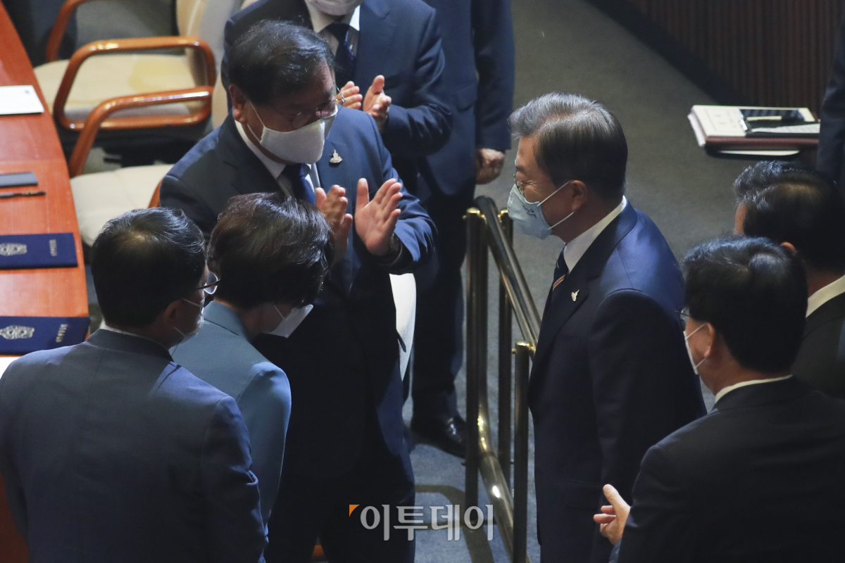 문재인 대통령이 16일 오후 서울 여의도 국회에서 열린 제21대 개원식에서 연설을 위해 입장하고 있다.