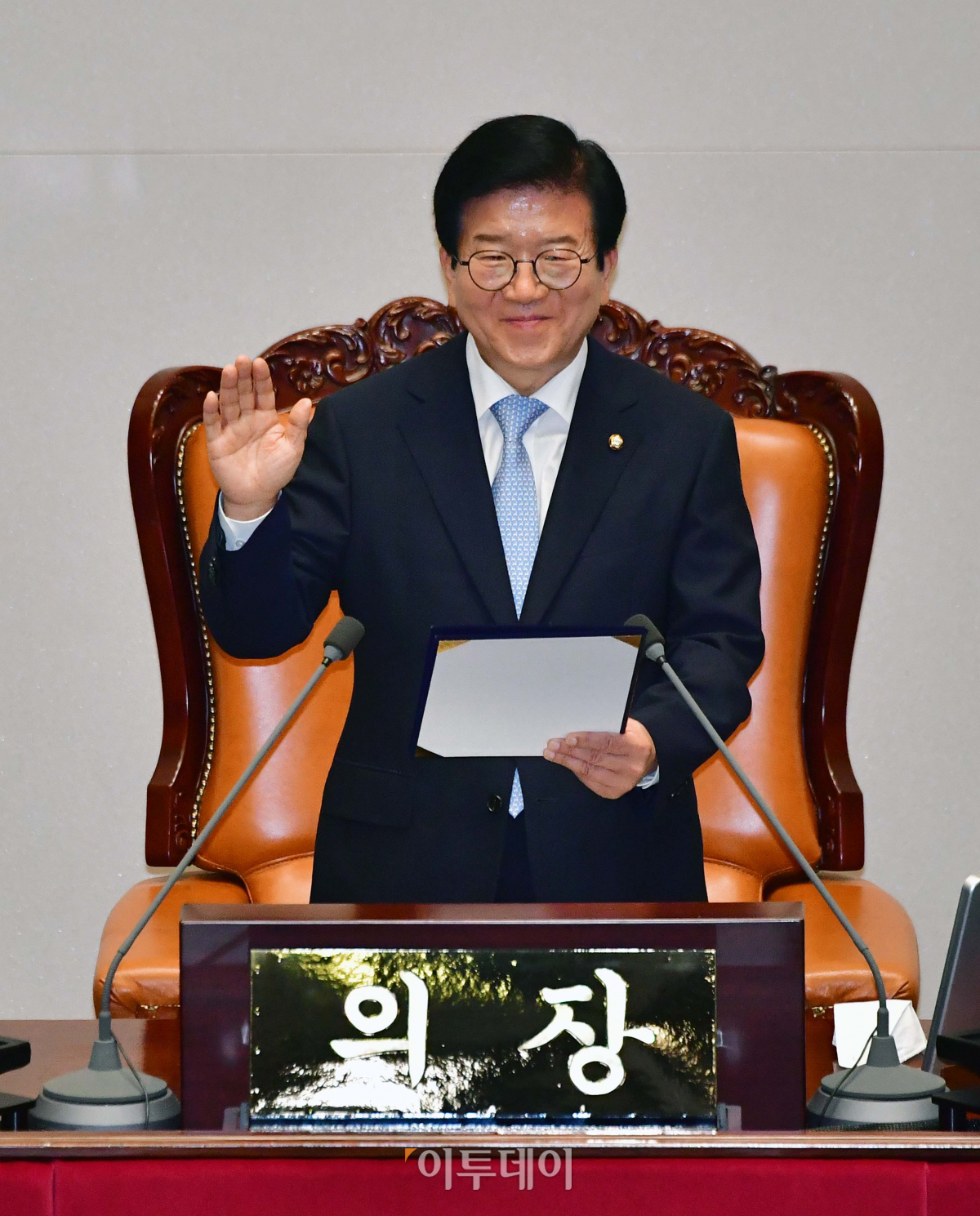 박병석 국회의장이 16일 국회에서 열린 제21대 국회 개원식에 참석해 국회의원 선서를 하고 있다.