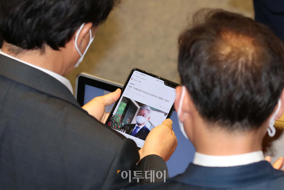 16일 서울 여의도 국회에서 열린 제21대 국회 개원식에서 윤후덕(왼쪽), 이광재 더불어민주당 의원이 대법원에서 무죄취지의 파기환송 선고를 받은 이재명 지사 기사를 보고 있다.