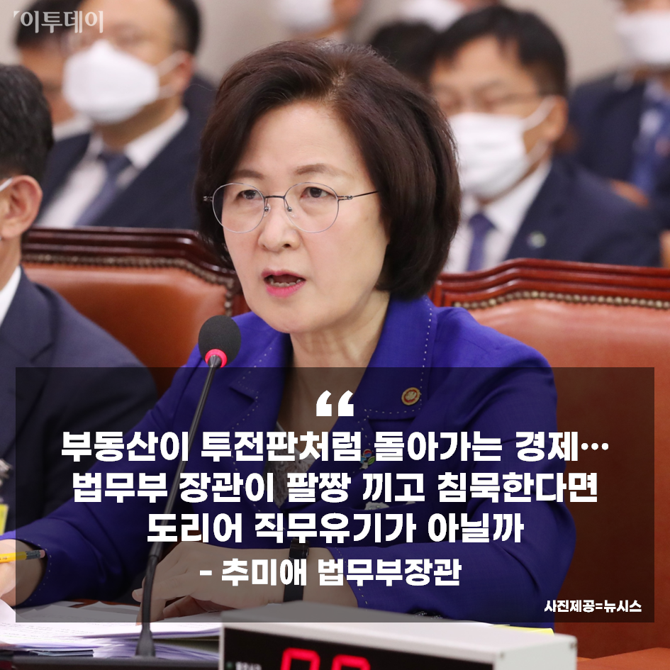 추미애 법무부 장관이 "부동산이 투전판처럼 돌아가는 경제를 보고 도박 광풍에 법무부 장관이 팔짱 끼고 있을 수 없듯 침묵한다면 도리어 직무유기"라고 주장했습니다. 추미애 장관은 20일 페이스북에 "저의 '금부 분리 제안'을 듣보잡이라고 비판한다. 그런데 벌써 하룻밤 사이 듣보잡(듣도 보도 못한 잡것)이 실제 상황이 됐다"며 18일 추 장관의 제안을 '듣보잡 이론'으로 비판한 오세훈 전 서울시장에 반박했습니다.