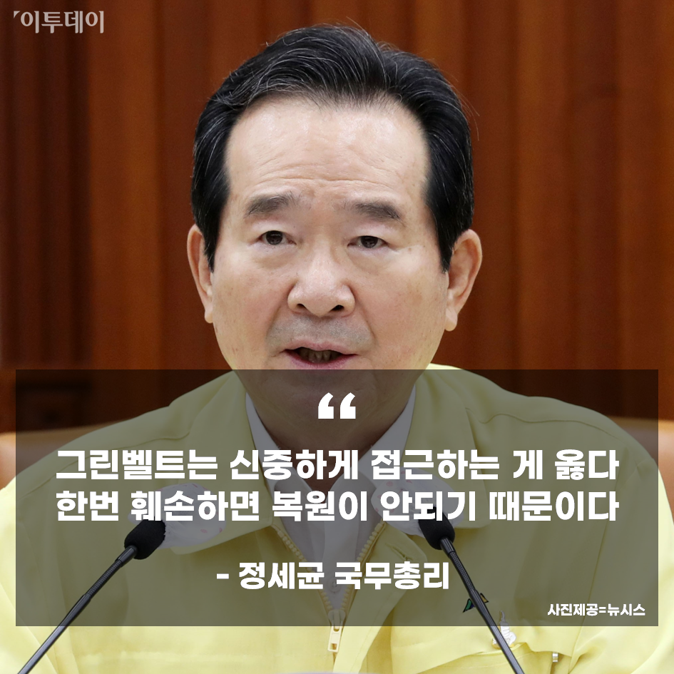 정세균 국무총리가 당정이 검토 중인 그린벨트(개발제한구역) 해제 방안에 대해 "신중하게 접근하는 게 옳다. 그린벨트는 한번 훼손하면 복원이 안 되기 때문"이라고 의견을 나타냈습니다. 정세균 총리는 19일 KBS 1TV '일요진단 라이브'에 출연해 '서울시의 반대에도 국토교통부 장관 직권으로 그린벨트를 해제할 수 있느냐'는 질문에 "법적으로 가능할지는 모르지만, 그렇게 정책을 하는 것은 바람직하지 않다고 본다"고 답했습니다.