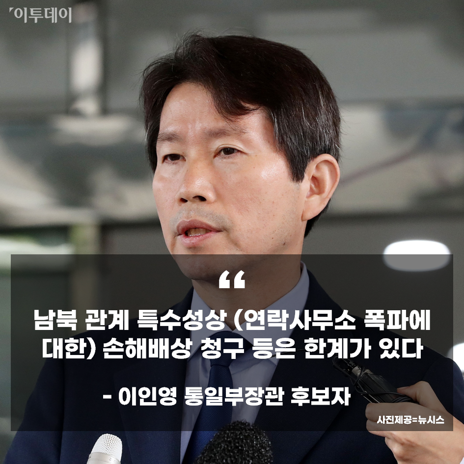 이인영 통일부 장관 후보자가 북한의 개성 남북공동 연락 사무소 폭파에 대해 손해배상 책임을 묻기 어렵다는 취지로 국회에 답변한 것이 확인됐습니다. 19일 미래통합당 정진석 의원실에 따르면 이인영 후보자는 '연락 사무소 폭파와 관련해 정부 차원에서 손해배상을 추진할 의지가 있느냐'는 질의에 "남북 관계 특수성상 손해배상 청구 등 사법 절차에 따라 문제를 해결하는 데는 한계가 있다"고 주장했습니다. 이어 "정부는 조속히 남북 대화를 재개하여 관련 문제의 실질적 해결 노력을 지속해 나갈 계획"이라고 답변했습니다.