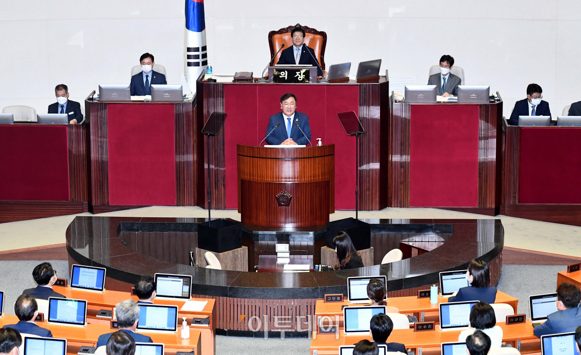 김태년 더불어민주당 원내대표가 20일 서울 여의도 국회에서 열린 본회의에서 교섭단체 대표연설을 하고 있다.